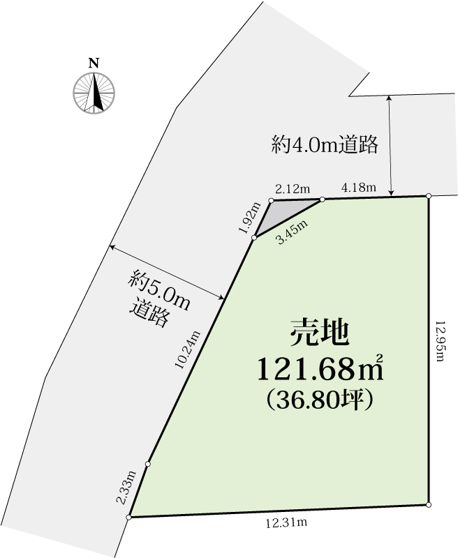 - 北東側幅員約4m公道に接道約7.6m・北西側幅員約5m公道に接道約12.5m